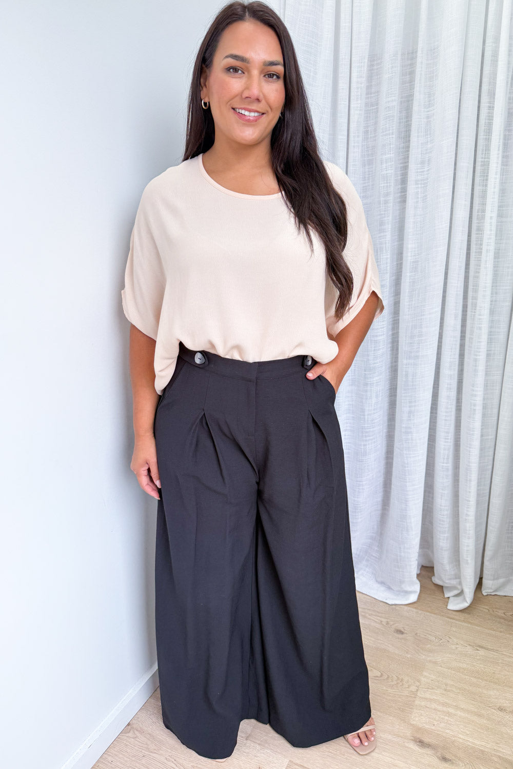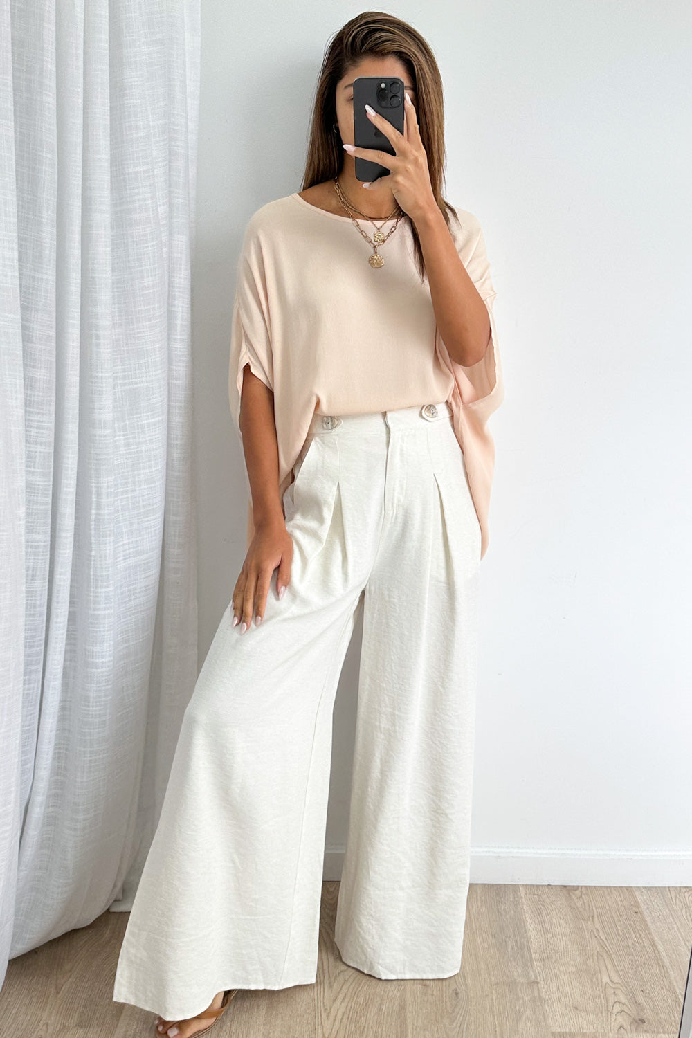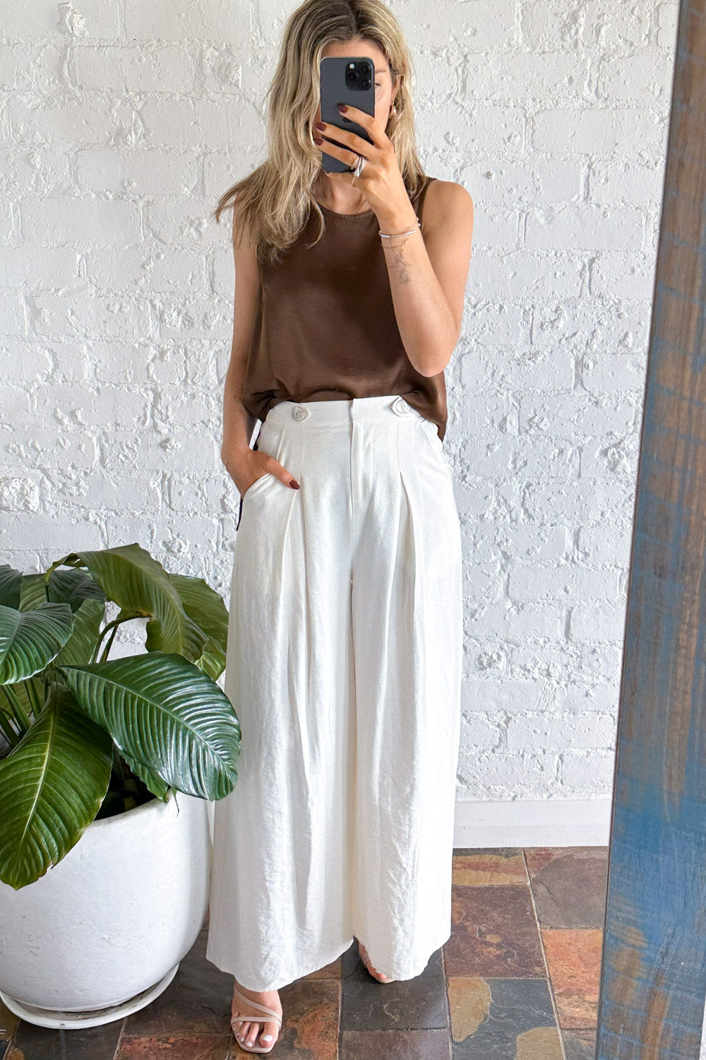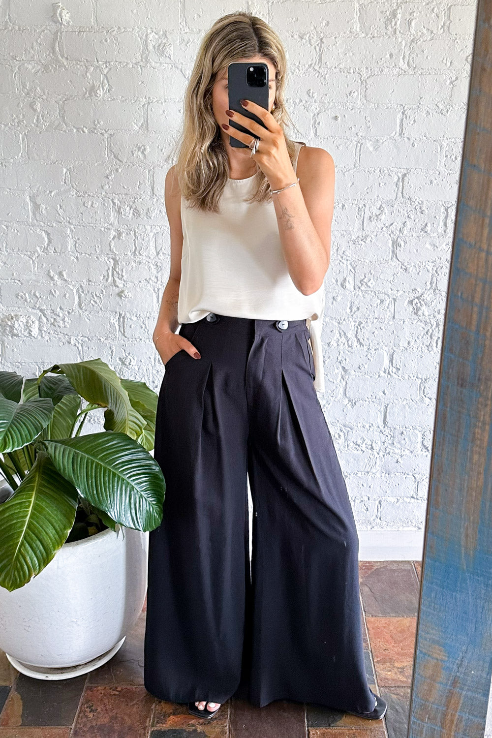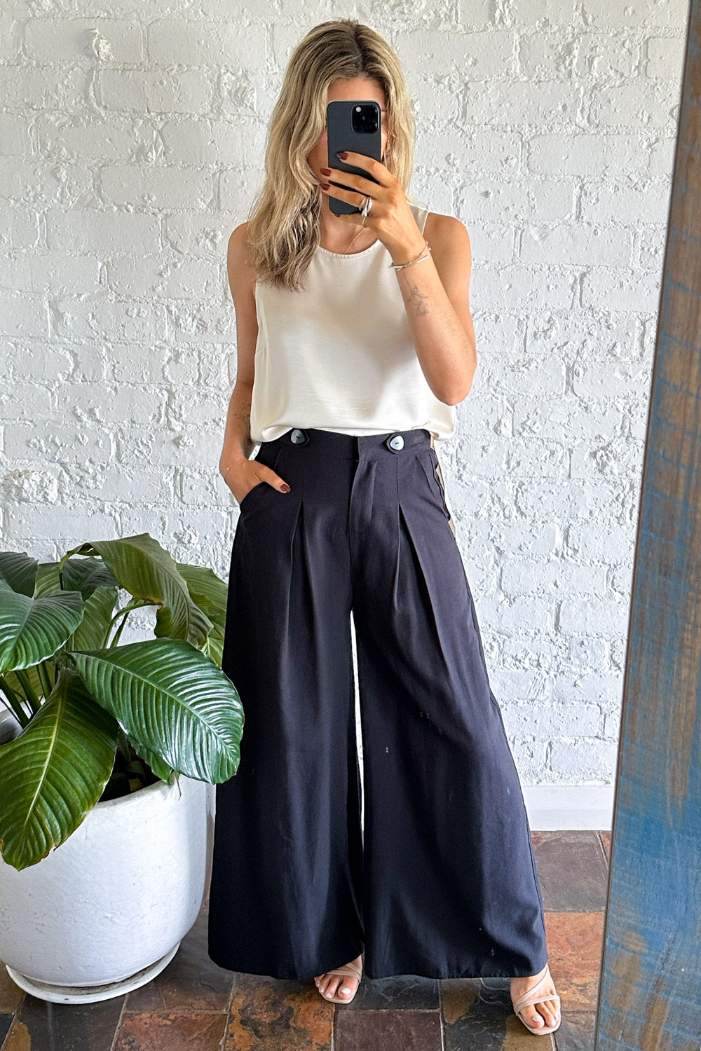 Gorgeous. A really, really good shape in a really, really good fabric. Wide leg and loose, they look and feel amazing on. Functional pockets, elastic at the back and some gorgeous button detail at the front on the hips, we love them.
