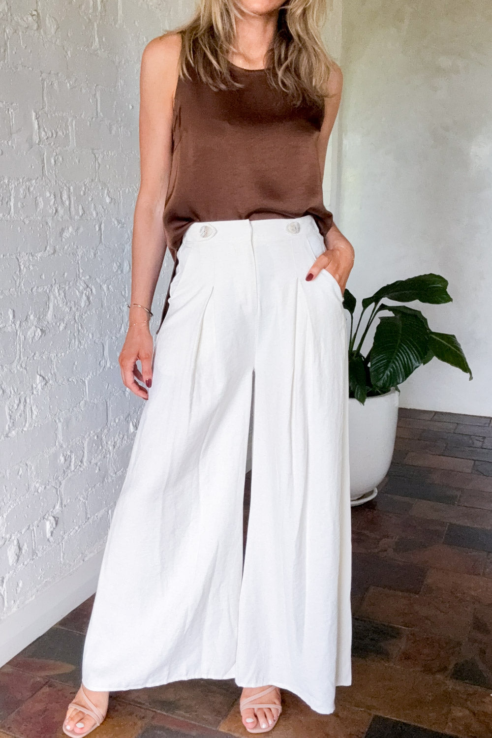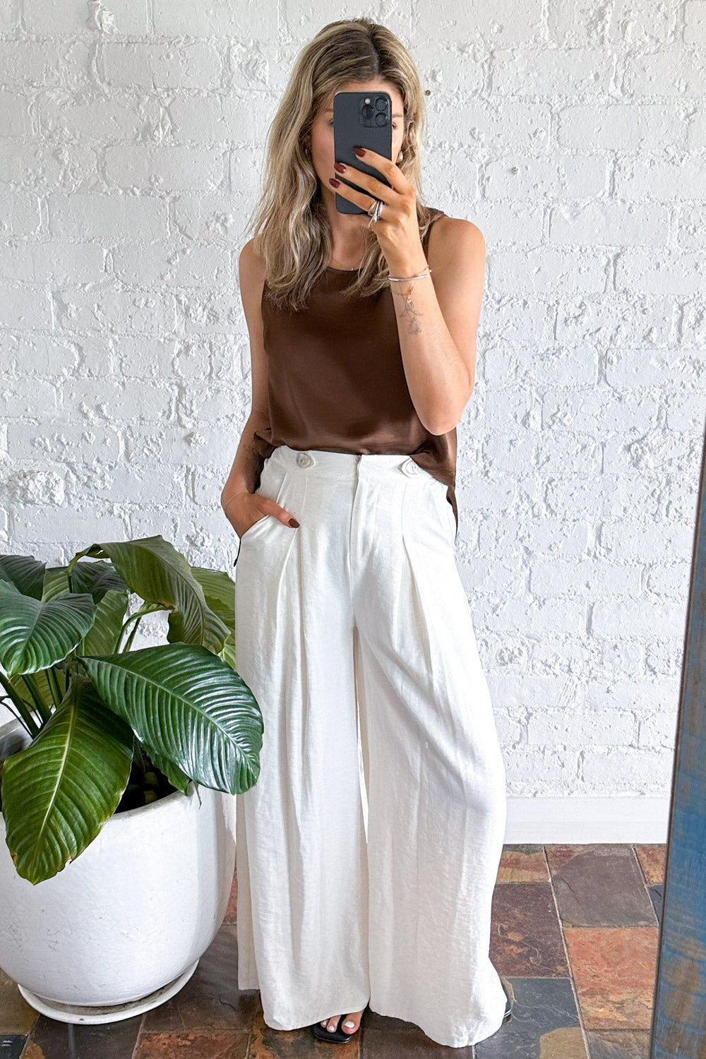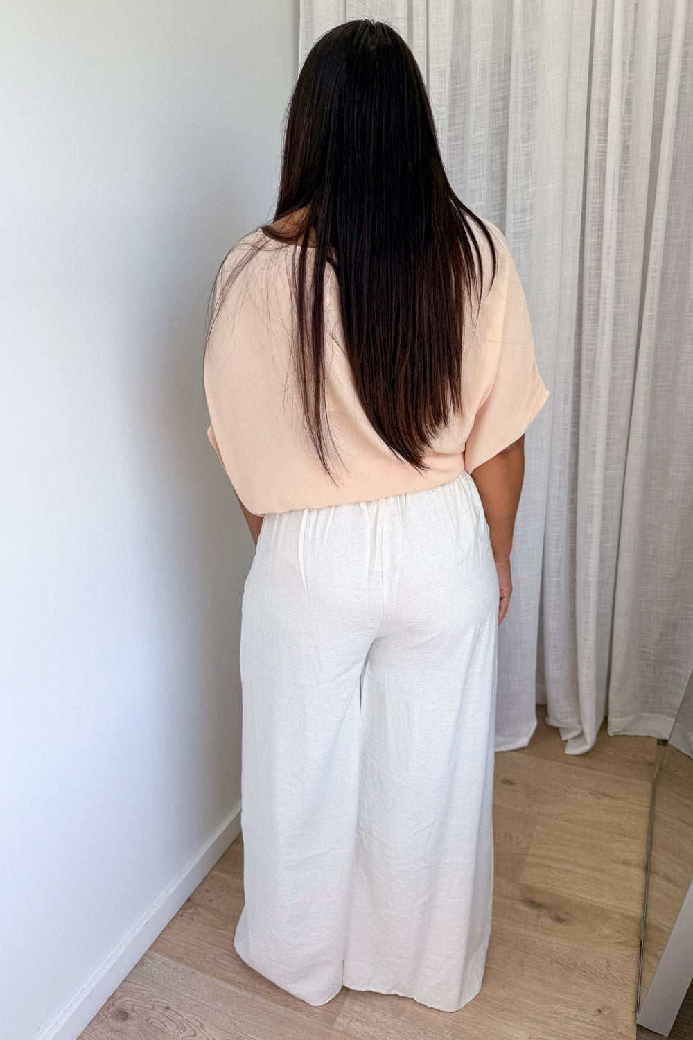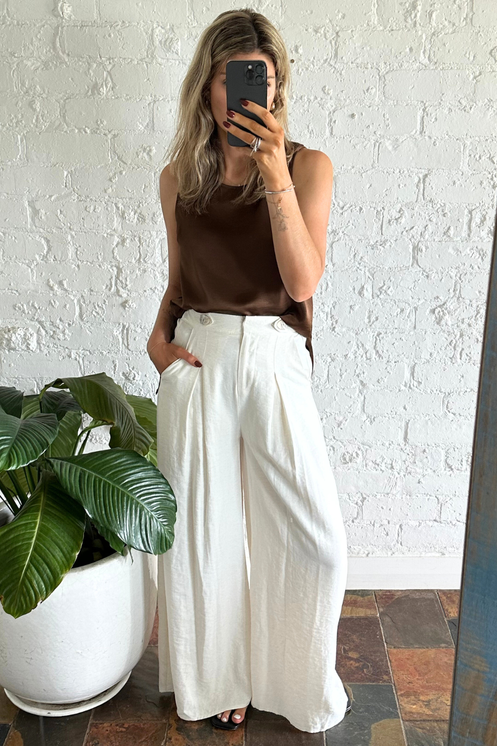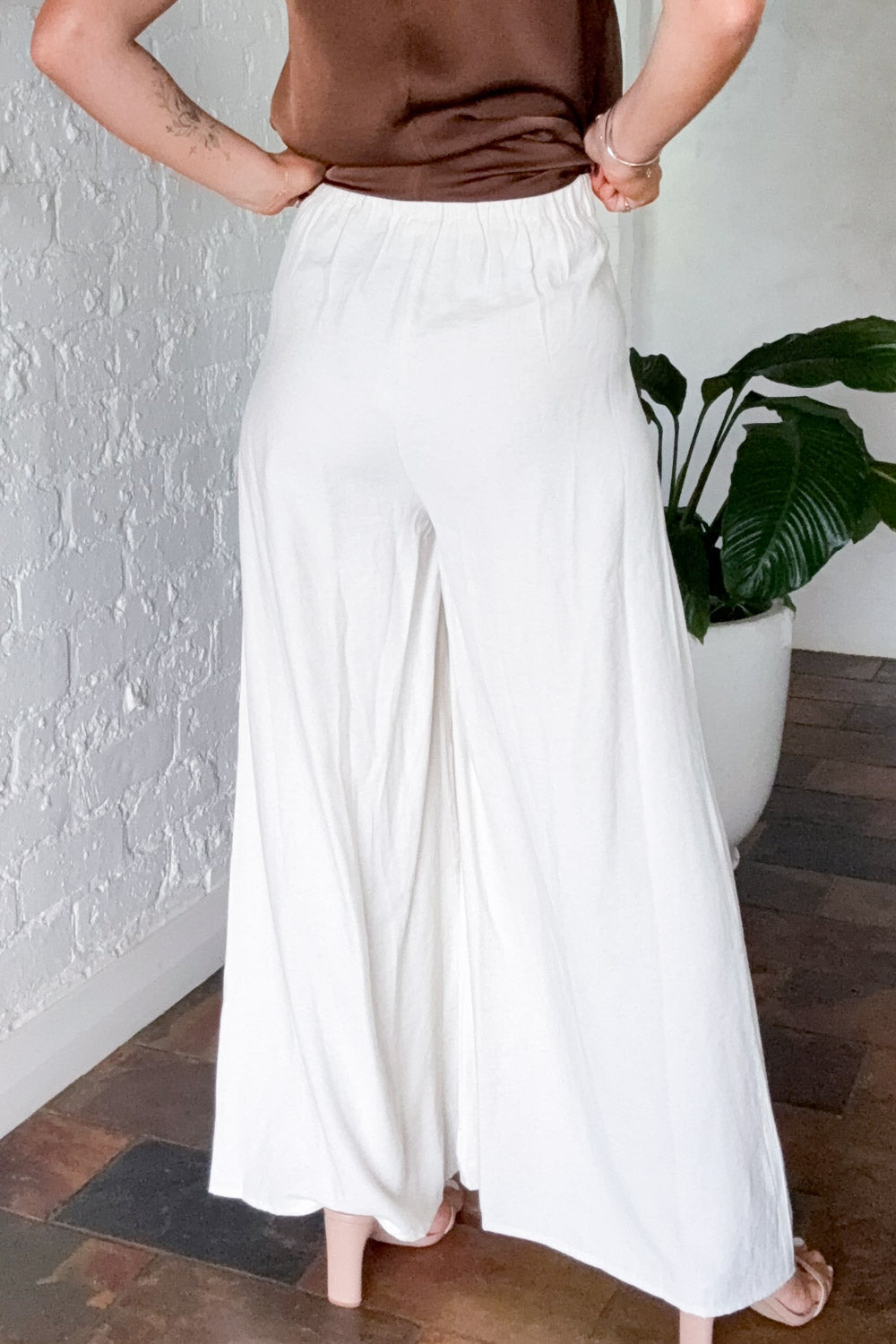 Gorgeous. A really, really good shape in a really, really good fabric. Wide leg and loose, they look and feel amazing on. Functional pockets, elastic at the back and some gorgeous button detail at the front on the hips, we love them.