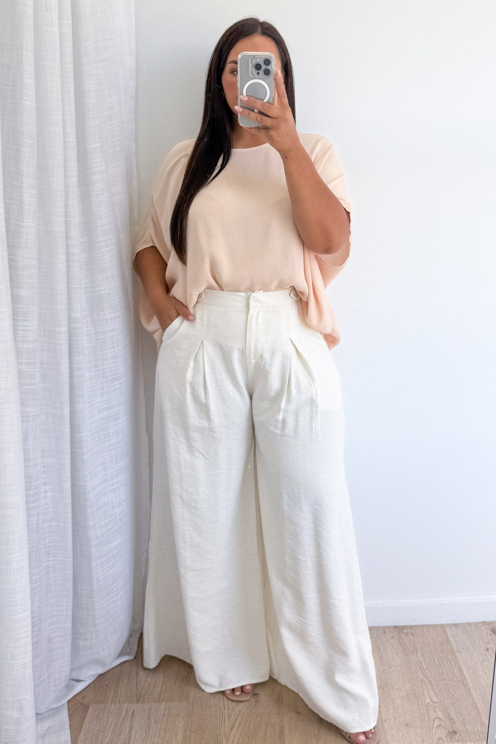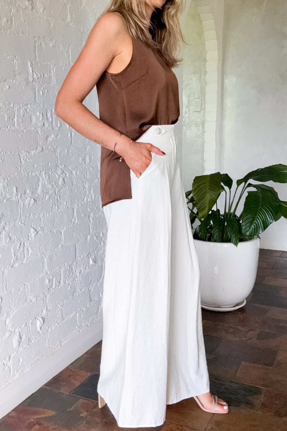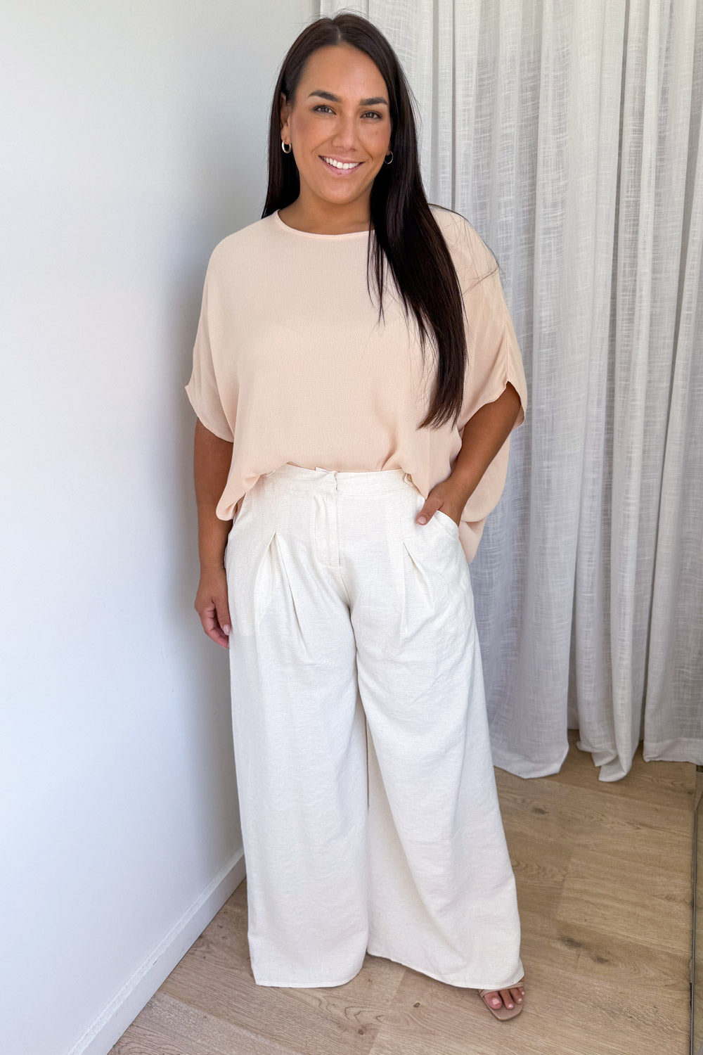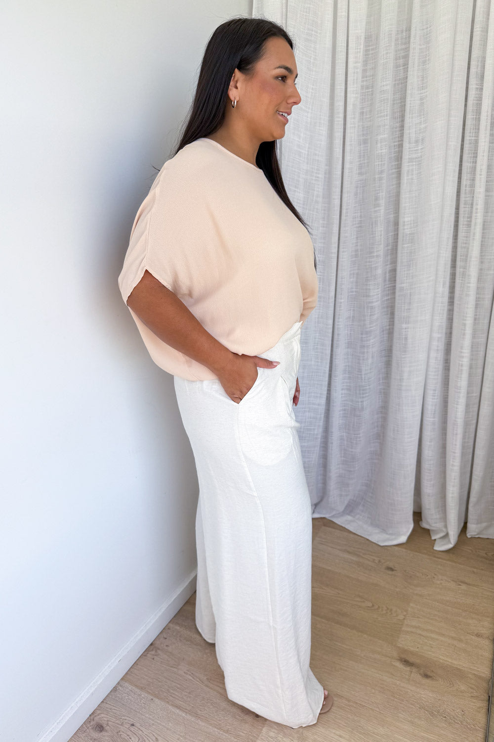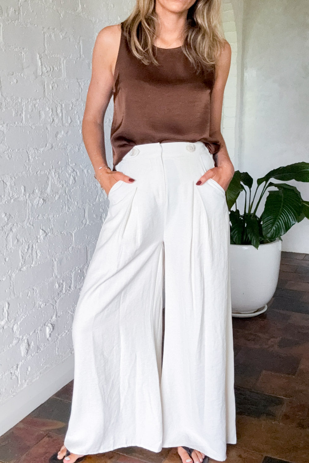 Gorgeous. A really, really good shape in a really, really good fabric. Wide leg and loose, they look and feel amazing on. Functional pockets, elastic at the back and some gorgeous button detail at the front on the hips, we love them.