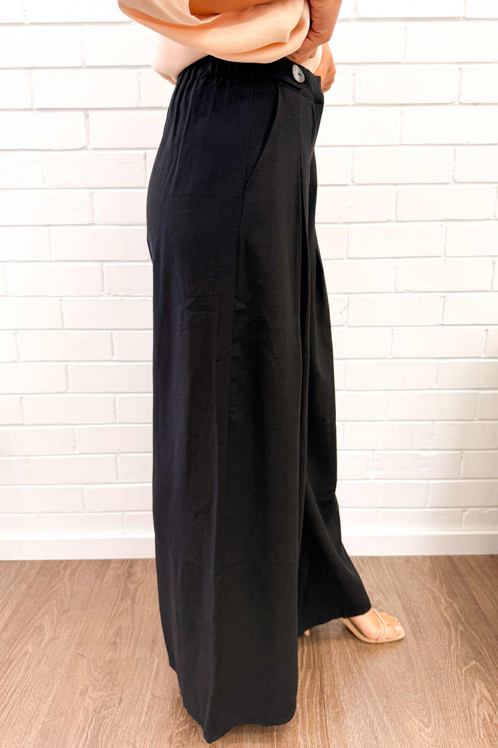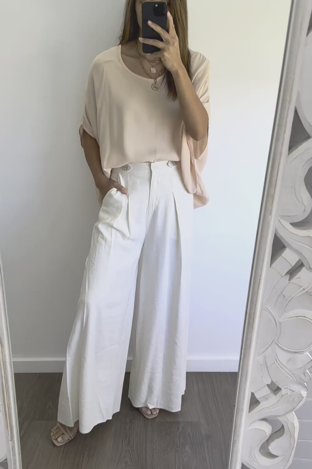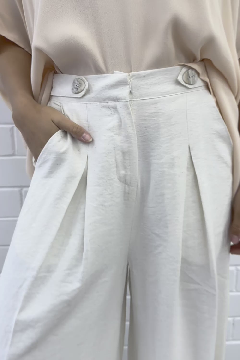 Gorgeous. A really, really good shape in a really, really good fabric. Wide leg and loose, they look and feel amazing on. Functional pockets, elastic at the back and some gorgeous button detail at the front on the hips, we love them.