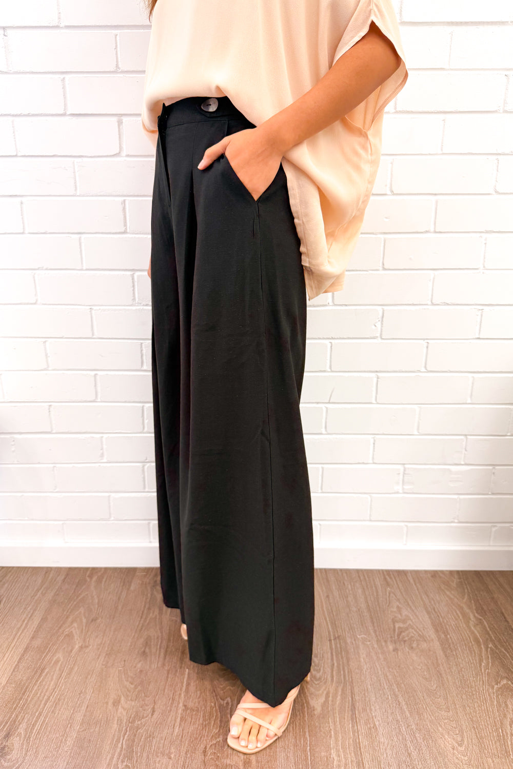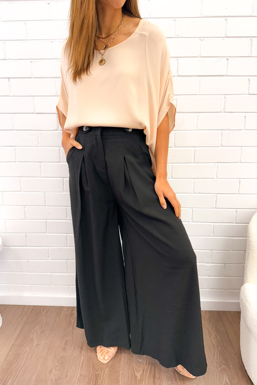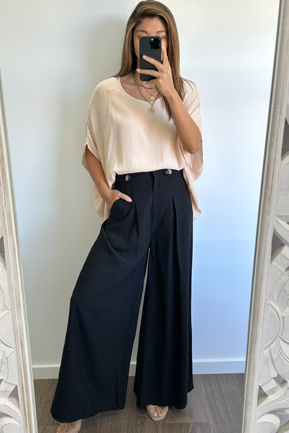 Gorgeous. A really, really good shape in a really, really good fabric. Wide leg and loose, they look and feel amazing on. Functional pockets, elastic at the back and some gorgeous button detail at the front on the hips, we love them.