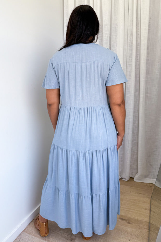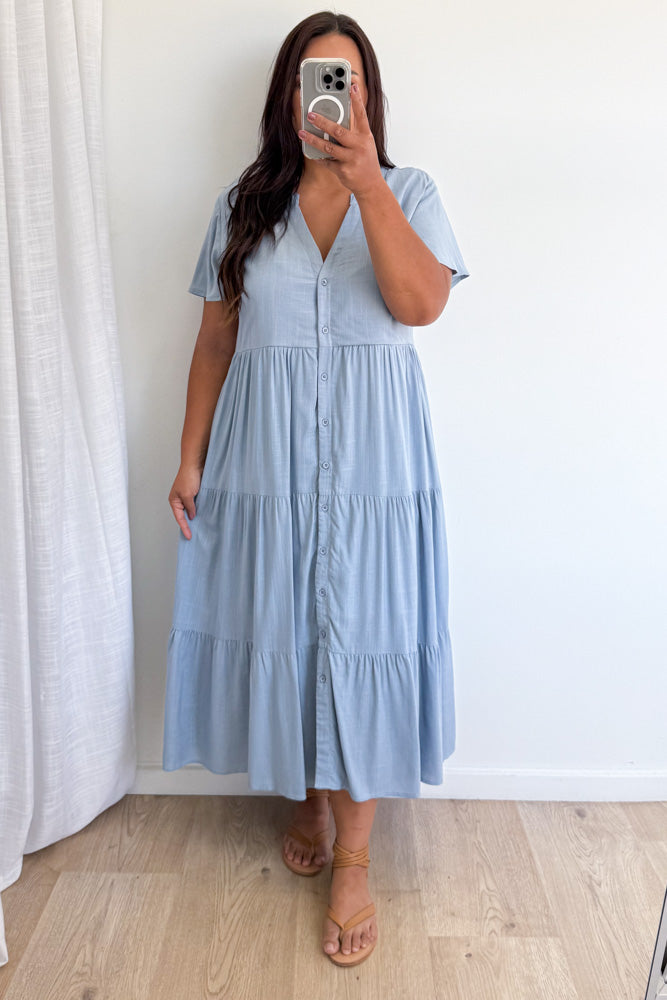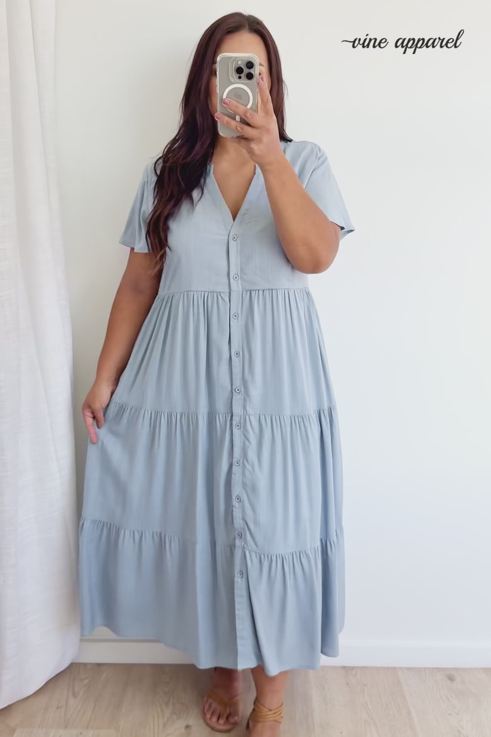 If you love our Teacher Dress, you will love this! Same design on a linen blend fabric! Talk about an EXCELLENT basic dress! It looks fab on all shapes and sizes, as in it just drops - doesn't sit anywhere you don't want it to, and the fabric FEELS nice on. A flattering V neck, pockets, and functional buttons.
