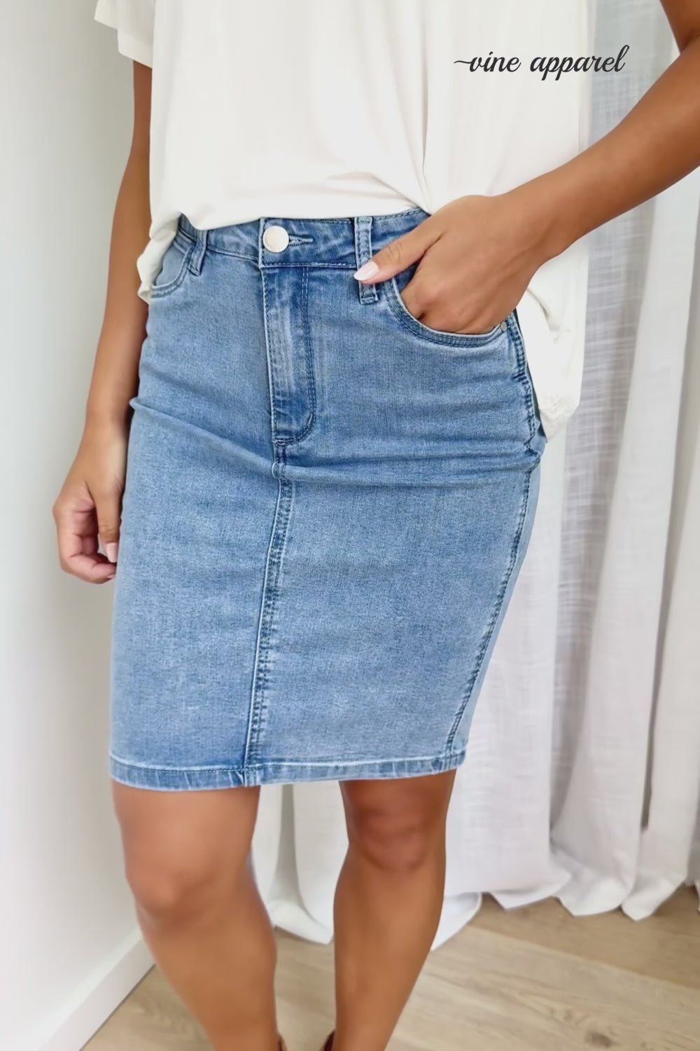 Just a simple easy denim skirt, with stretch and pockets. The length is good, the stretch means it moves with you, and it's just comfy.