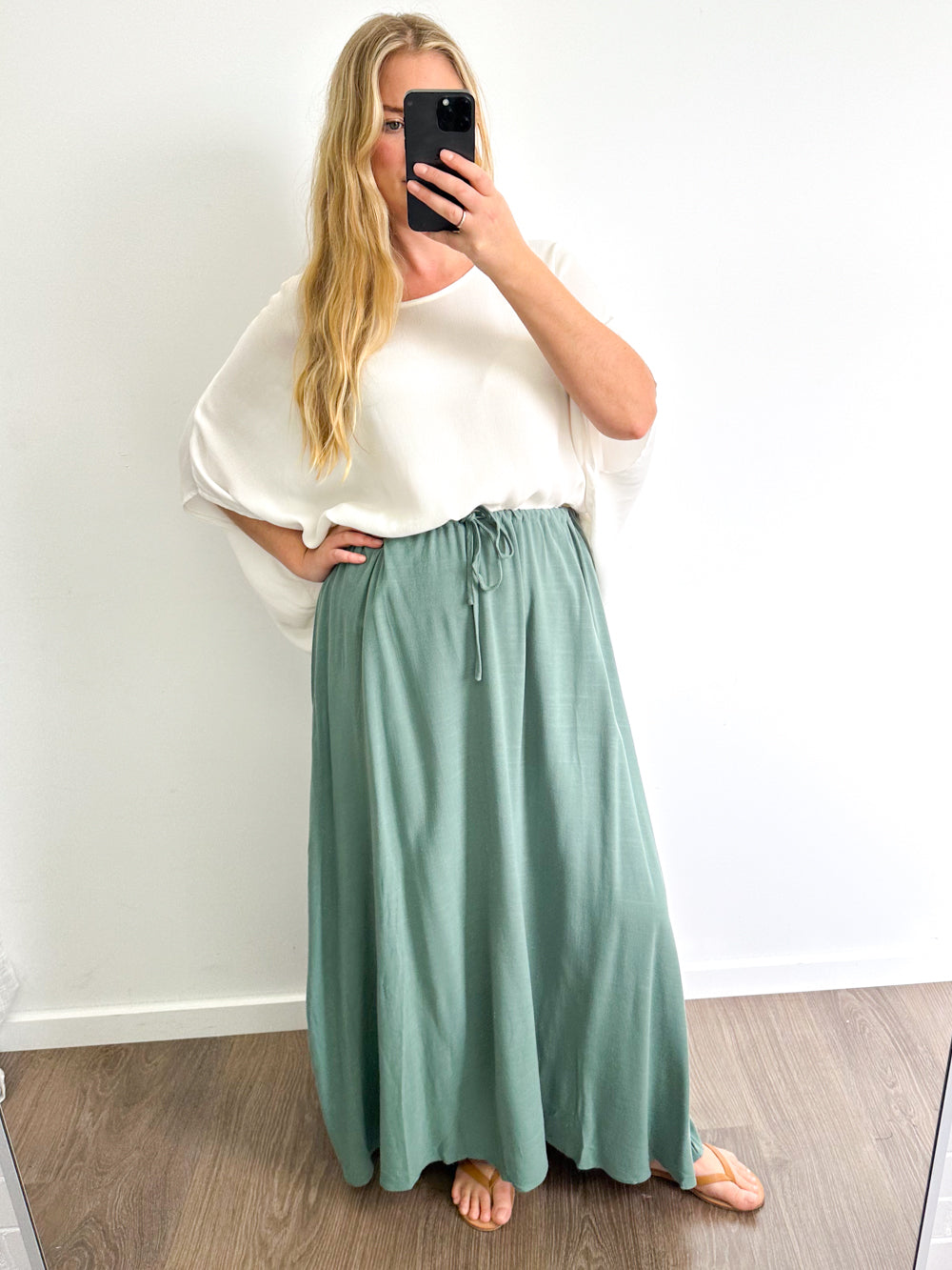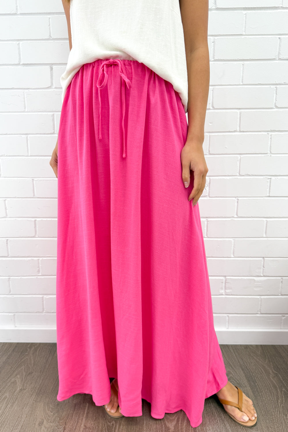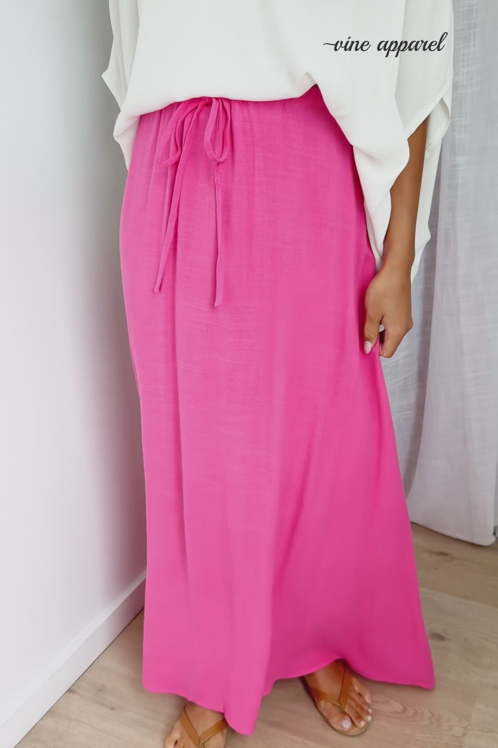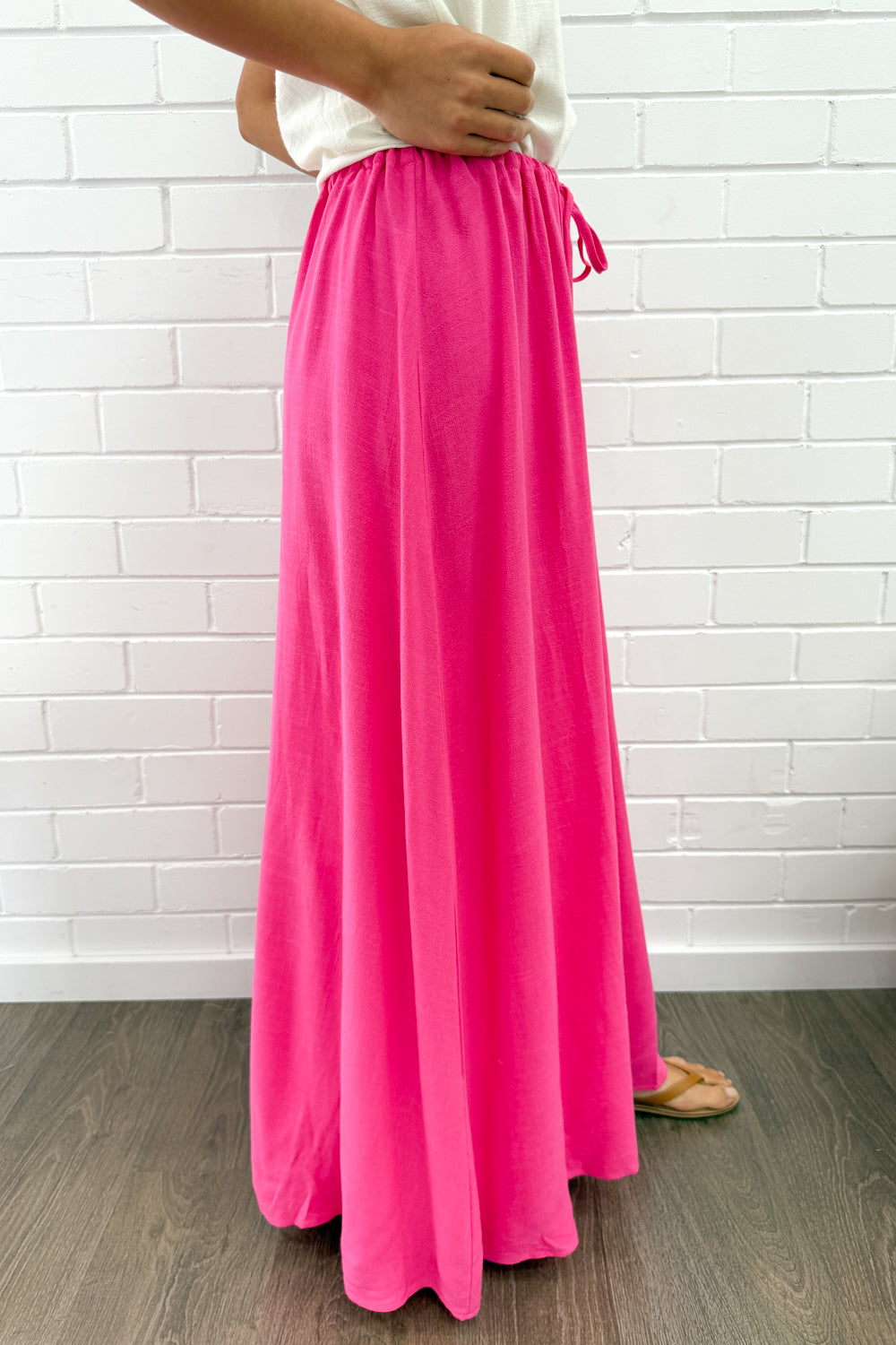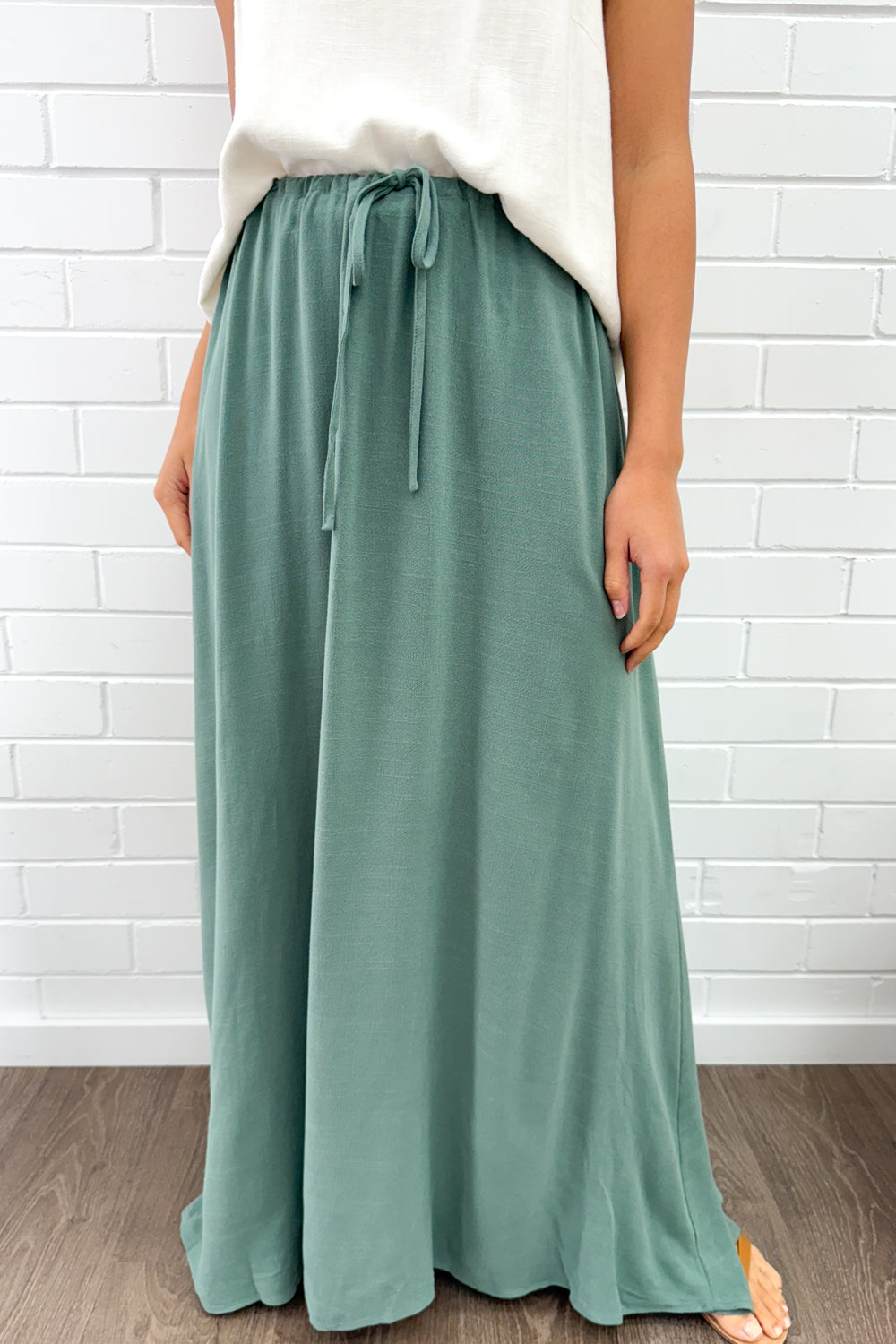 A lovely linen feel with an elastic waist, it feels nice AND looks nice on. Not only is the waist elastic, it has a drawstring, so you can pull it in or wear it looser, as in up higher or down lower.