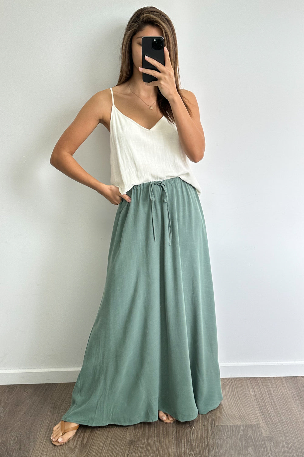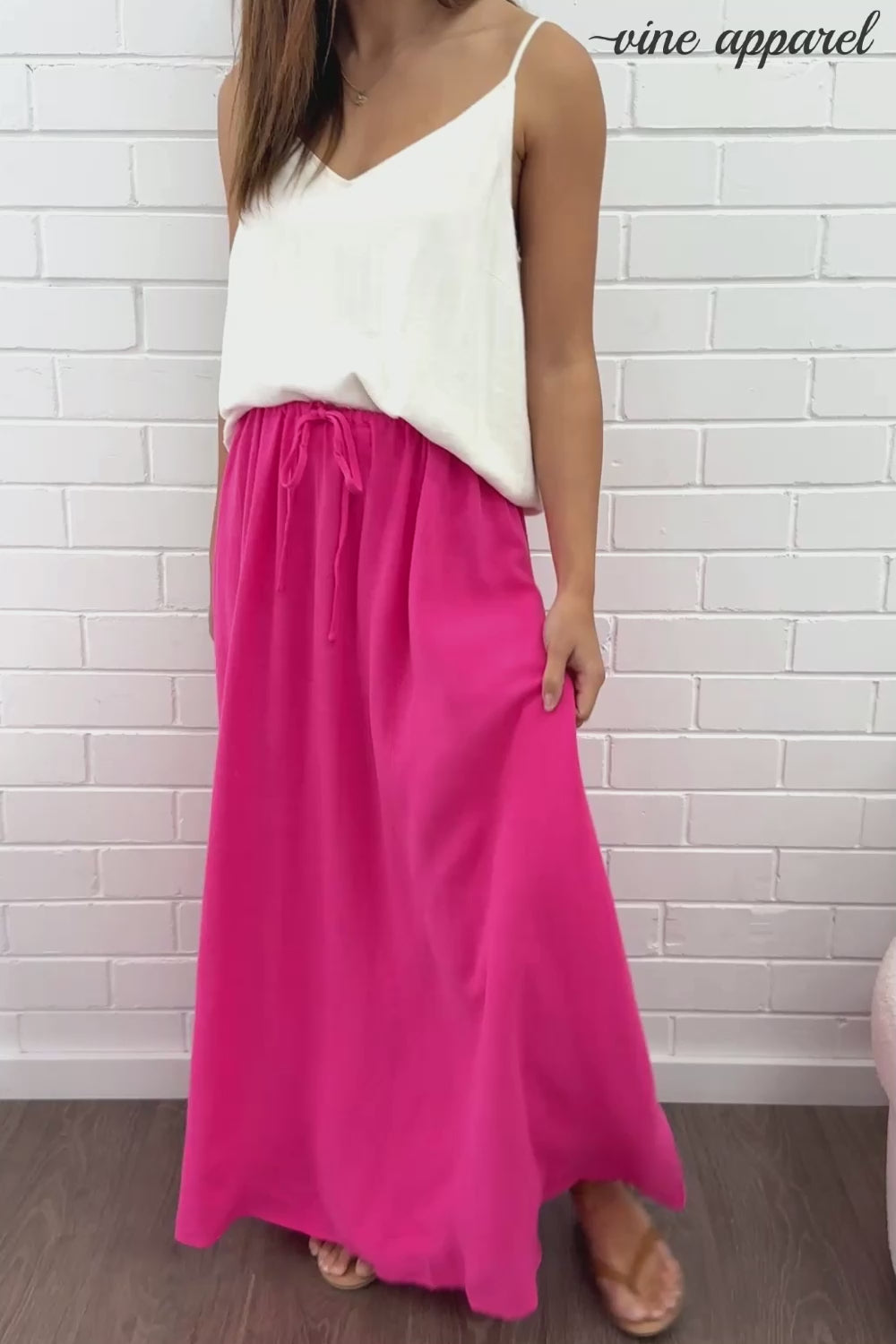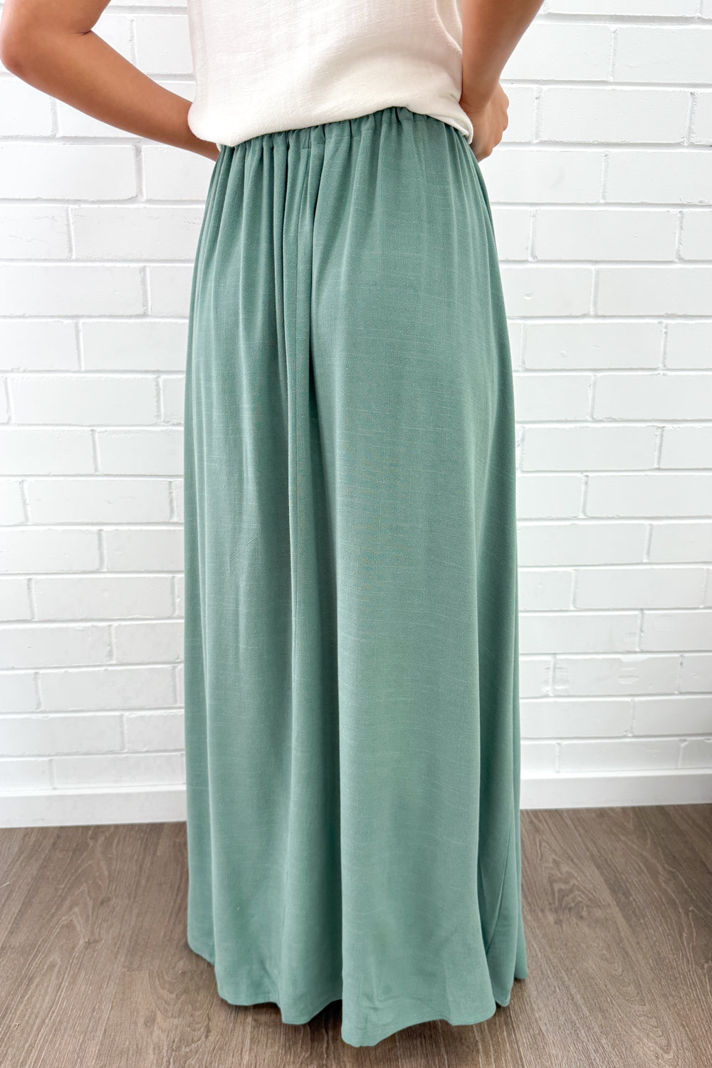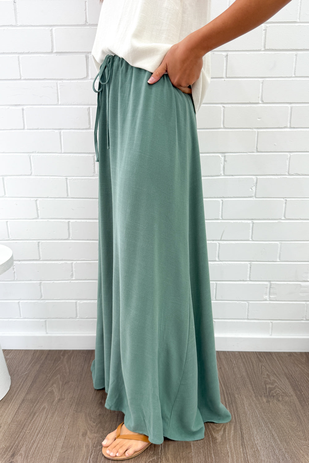 A lovely linen feel with an elastic waist, it feels nice AND looks nice on. Not only is the waist elastic, it has a drawstring, so you can pull it in or wear it looser, as in up higher or down lower.