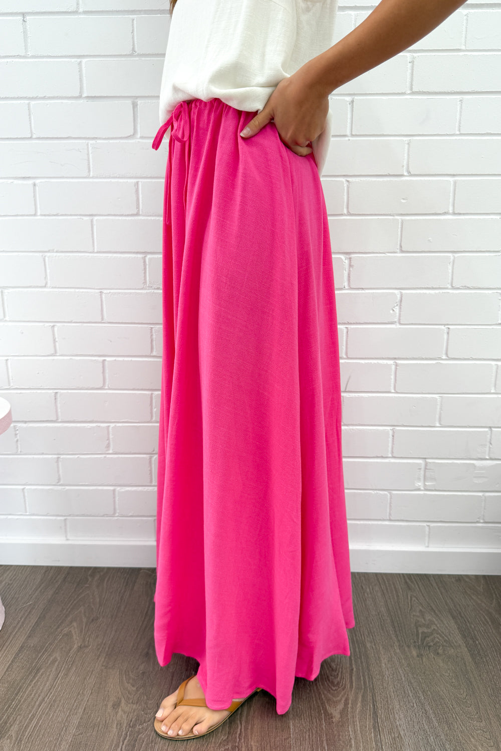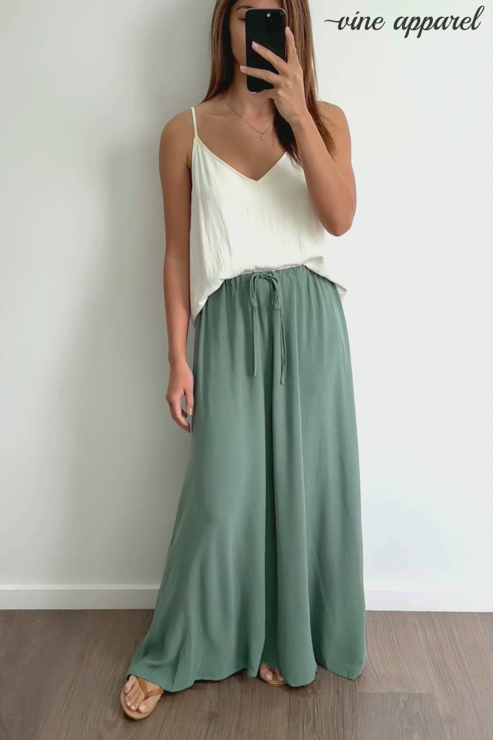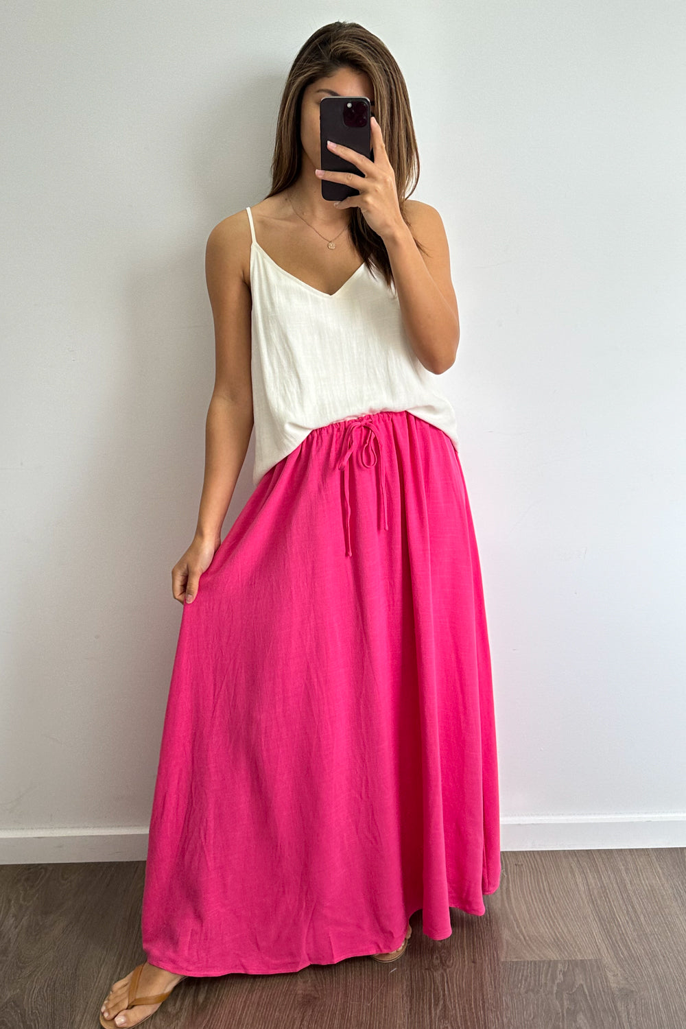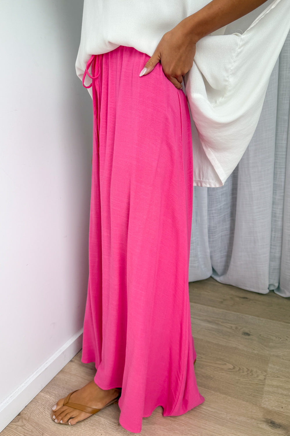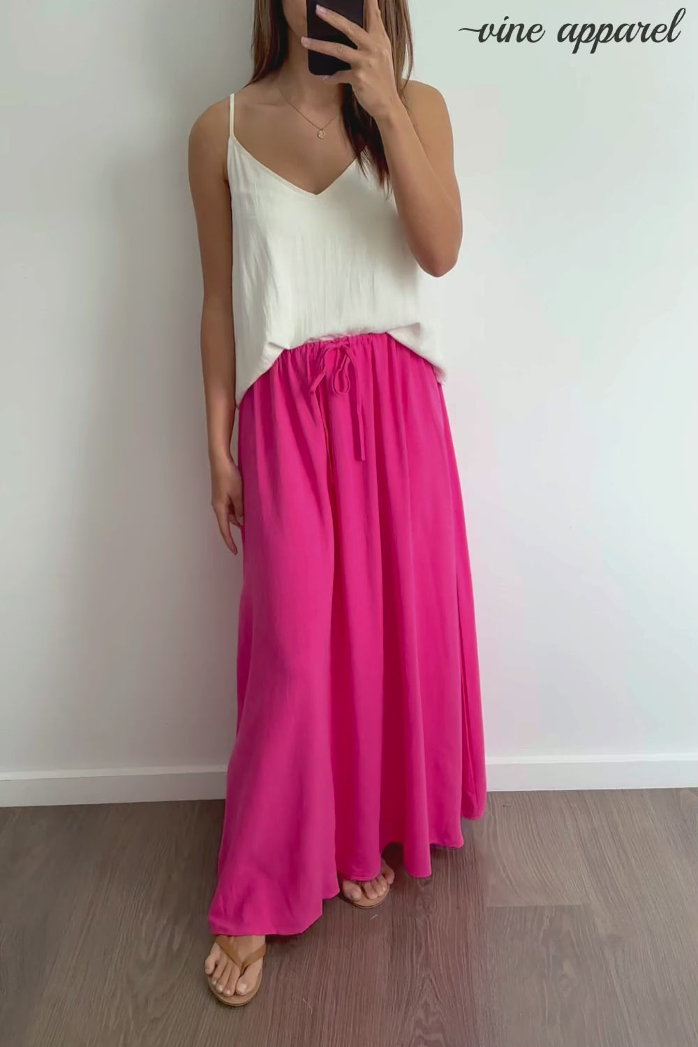 A lovely linen feel with an elastic waist, it feels nice AND looks nice on. Not only is the waist elastic, it has a drawstring, so you can pull it in or wear it looser, as in up higher or down lower.