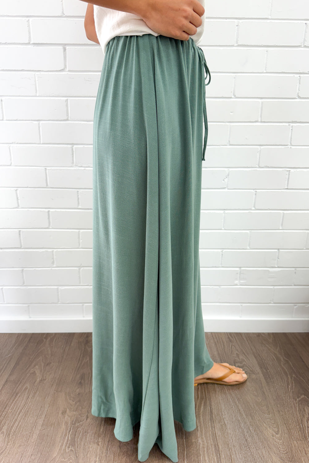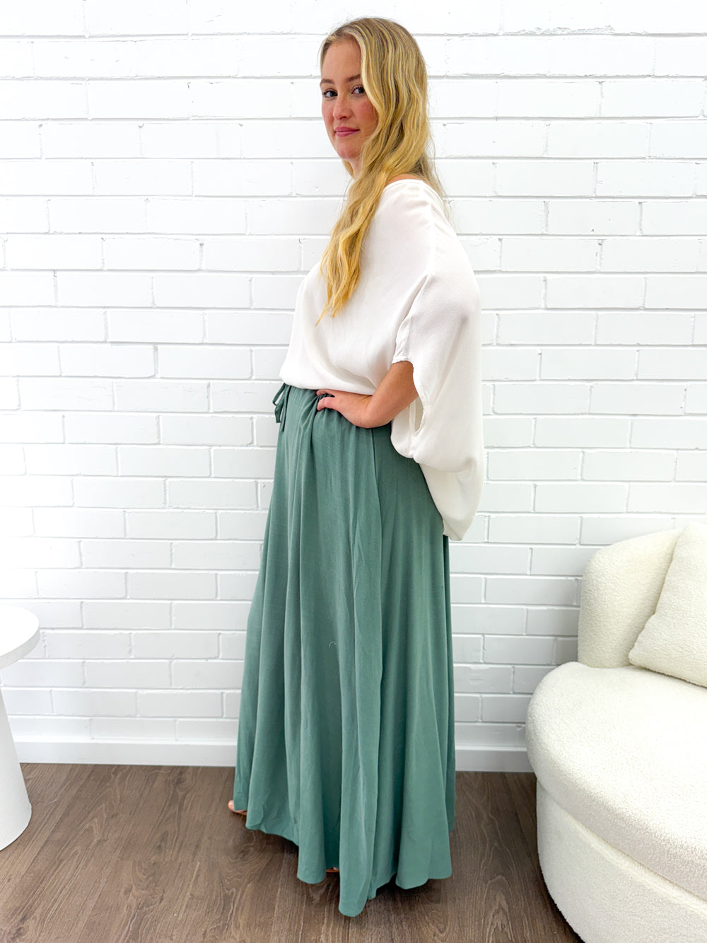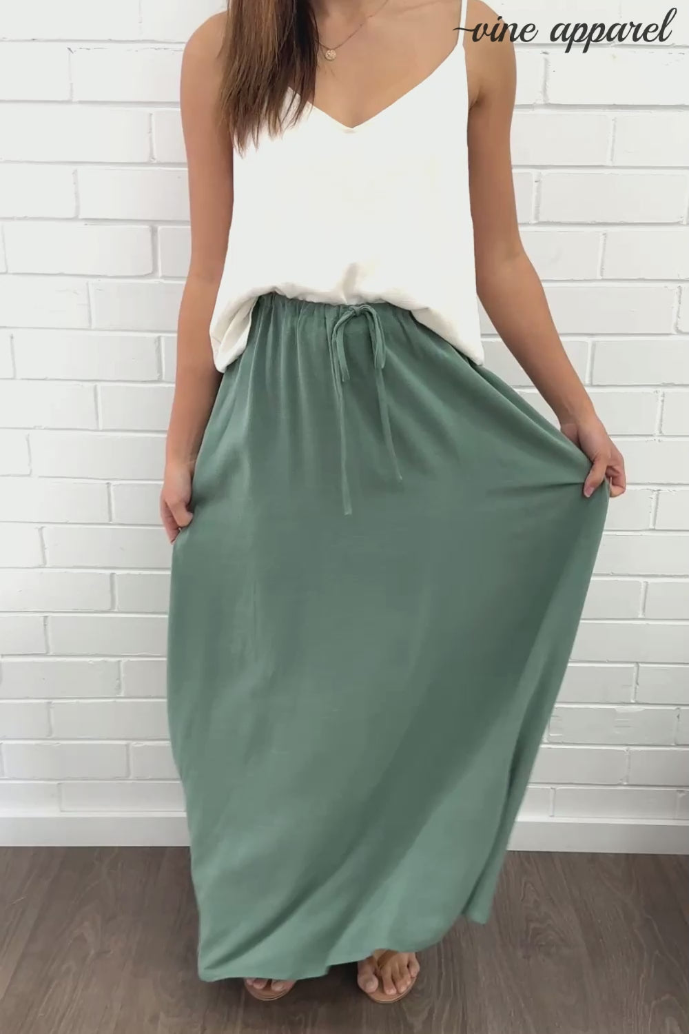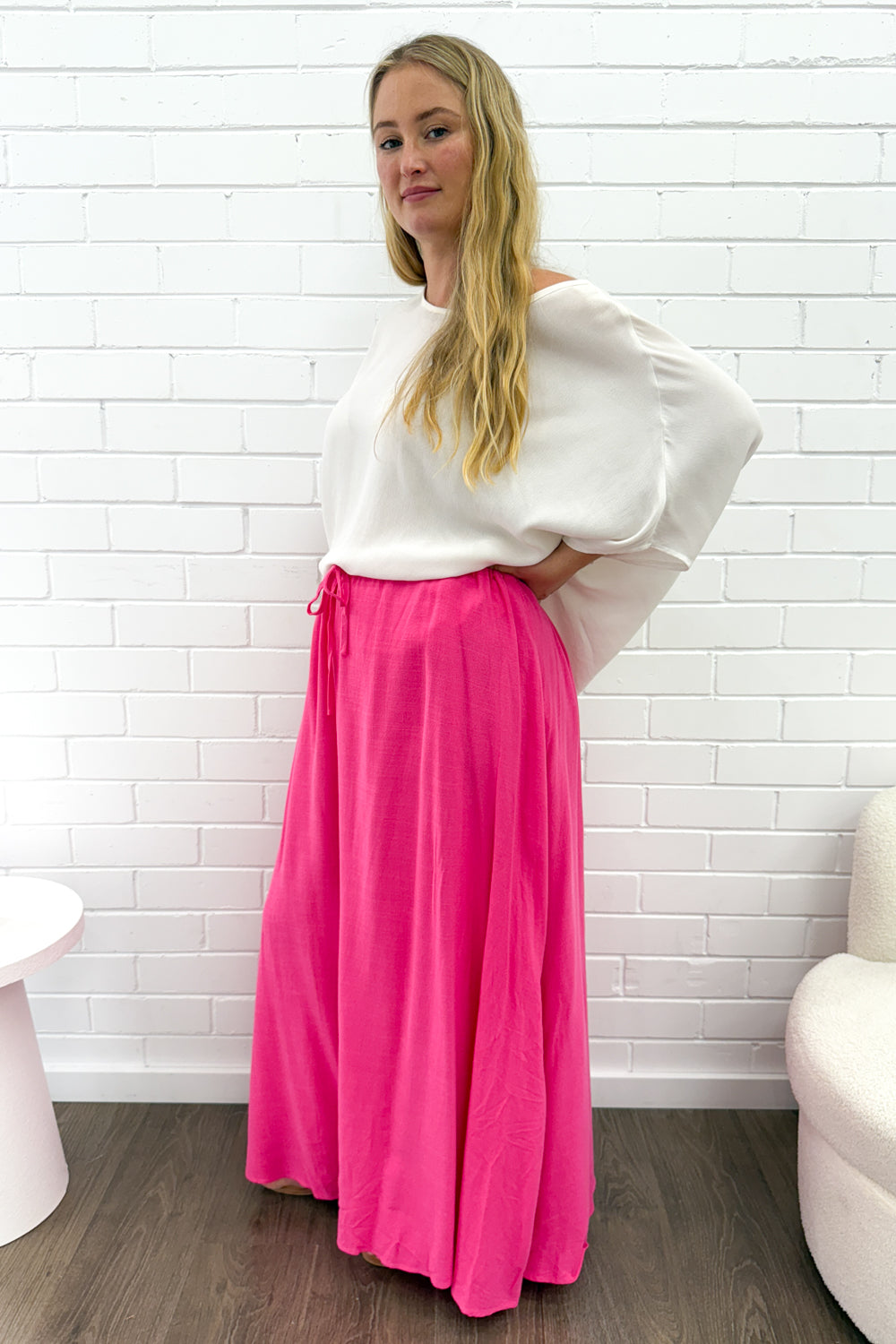 A lovely linen feel with an elastic waist, it feels nice AND looks nice on. Not only is the waist elastic, it has a drawstring, so you can pull it in or wear it looser, as in up higher or down lower.