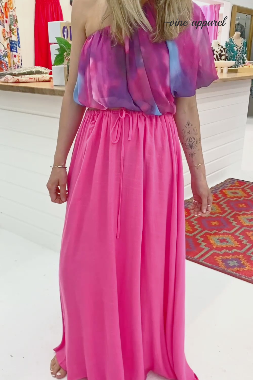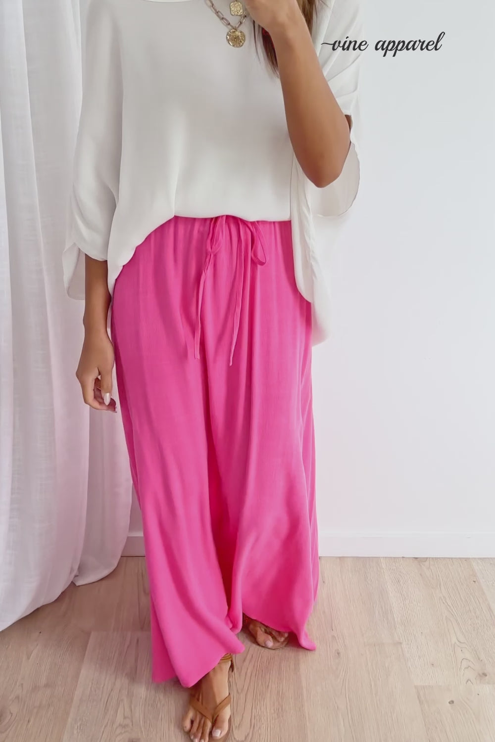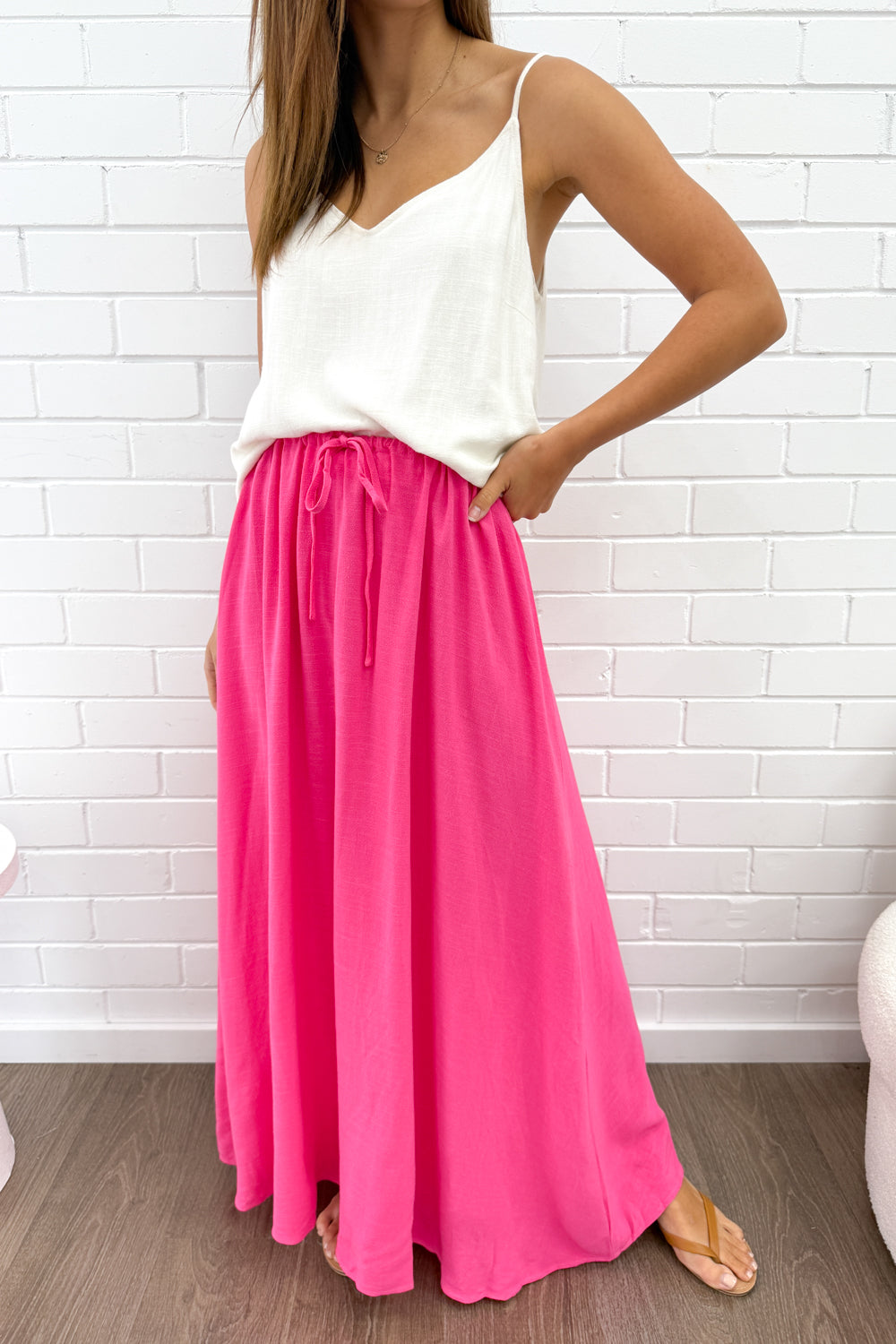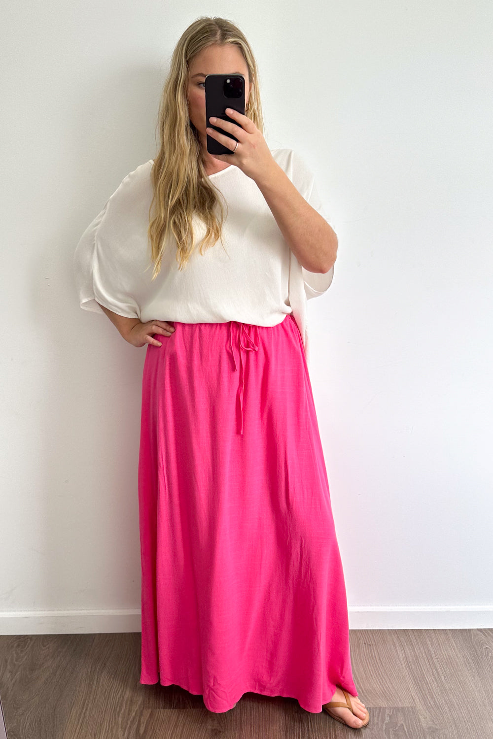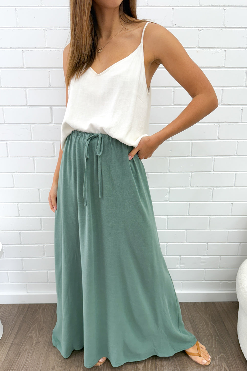 A lovely linen feel with an elastic waist, it feels nice AND looks nice on. Not only is the waist elastic, it has a drawstring, so you can pull it in or wear it looser, as in up higher or down lower.