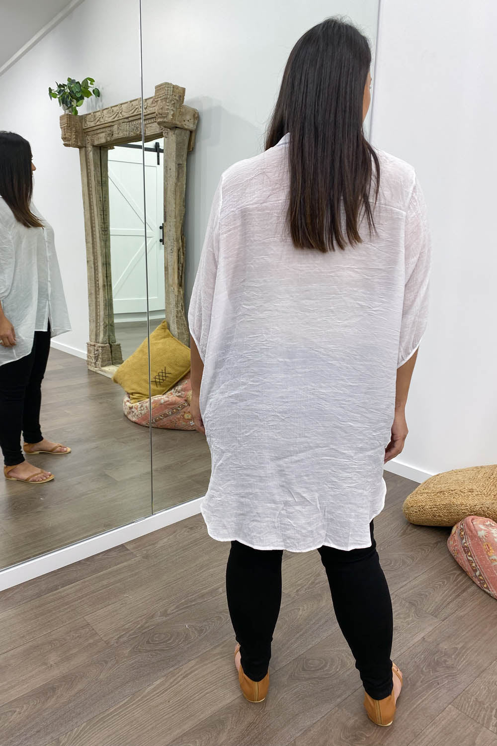 Oversized yet flattering, wear it loosely over denim shorts, jeans, or even leggings, OR tuck it into the waist of these for a more sophisticated look.